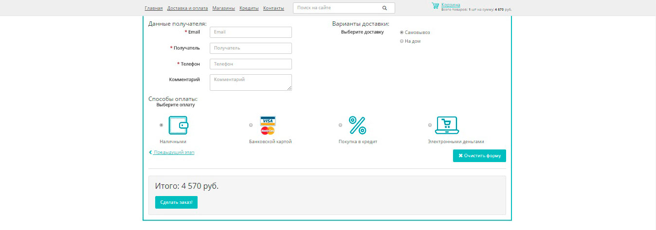 Переходим непосредственно к оформлению заказа, в которой Вам необходимо будет указать Ваши контактные данные: - e-mail (адрес электронной почты). - Ф,И,О, получателя. - ваш контактный телефон. - и оставть Ваш комментарий к заказу. К тому же вам необходимо выбрать способ доставки: - самовывоз. - доставка на дом. Так же при оформлении заказа Вам необходимо выбрать способ оплаты: - наличными. - банковской картой. - оформить покупку в кредит. - электронными деньгами(добавляются).