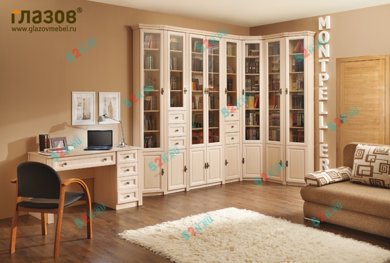 Модульная библиотека MONTPELLIER можно расположить в Вашем домашнем кабинете или гостиной, выбрав для компоновки именно то, что Вам нужно. Благодаря светлому декору Дуб Млечный, производит впечатление легкости, надежности и поддерживает позитивный рабочий настрой, при этом комната не кажется перегруженной мебелью. Высокие шкафы надежно крепятся к стене, а тонированные стекла защищают книги от прямых солнечных лучей, пожелтения страниц и пыли. Фасады шкафов по Вашему желанию можно навесить как на правую, так и на левую сторону. Рамочные фасады с филенкой, канелюры, карнизы придают композиции законченный вид. Модуль Карниз 4, уголки 1, 2, 3 и 4 устанавливаются при сборке, согласно подробной инструкции, и придают компоновке законченный вид. Классические канелюры выделены в самостоятельный модуль. Добор с канелюрами докупаются отдельно, по желанию заказчика. Рабочий стол - неотъемлемая часть любого рабочего пространства. Вместительный и функциональный. Стол письменный 1 выполнен в едином стиле со всей коллекцией. Его фрезерованная столешница укутана в прочную текстурную пленку ПВХ, что дополнительно защищает поверхность стола от царапин и повреждений. Тыльная сторона стола закрыта ЛДСП 16 мм, что дает дополнительную возможность расположить его не только у стены, но и в любом удобном для Вас месте, сохраняя тем самым эстетичный вид Вашей библиотеки. РАЗМЕРЫ УКАЗАНЫ БЕЗ УЧЁТА КАРНИЗА. ЦЕНА УКАЗАНА БЕЗ УЧЕТА КАРНИЗА.