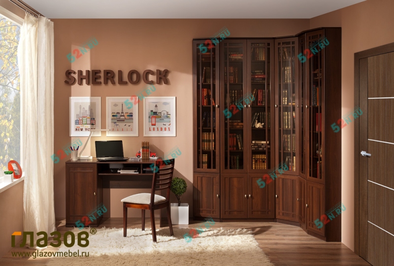 Идеальным местом для обустройства библиотеки в квартире является домашний кабинет. В нем Вы сможете заняться важными делами в спокойной обстановке или просто почитать любимую книгу. Благодаря модульности, библиотеку SHERLOCK можно расположить в Вашем домашнем кабинете, выбрав для компоновки именно те модули, которые Вам нужны. Письменный стол, расположенный у окна, сделает чтение и работу с документами максимально комфортным. В высоких изящных шкафах библиотеки SHERLOCK поместятся книги любого формата: от самых маленьких книг до больших иллюстрированных альбомов, поскольку Вы сами можете регулировать высоту полок. Тонированные стекла фасадов высоких книжных шкафов защитят книги от прямых солнечных лучей, пожелтения страниц, пыли и позволят без проблем найти нужную книгу. Завершающие модули библиотеки SHERLOCK: SHERLOCK 34 и 35 Шкаф для книг, позволят создать гармоничную и, в то же время, изысканную атмосферу в кабинете. Библиотека выполнена в одном декоре и стиле с гостиной SHERLOCK — Орех Шоколадный. Поэтому из её модулей Вы можете организовать небольшое функциональное рабочее место даже в гостиной. Классический 15 Стол письменный можно поставить между высокими шкафами библиотеки и навесить над ним 4 Шкаф навесной на любой удобной для Вас высоте. Шкафы крепятся к стене за подвесы.
