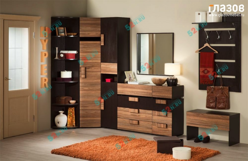 Современная модульная коллекция "HYPER" создана для молодых, динамичных и активных людей. Она проста и функциональна. Выпускается в наиболее востребованном сочетании цветов — Венге и Палисандр. Стильная и удобная Вешалка 2 имеет полочку для головных уборов. Тумба 1 выглядит свежо и оригинально благодаря декоративным нишам. А яркая Полка угловая 1 является идеальным местом для размещения необходимых мелочей, без которых не обойтись в любой прихожей. Фасады модулей Шкаф для одежды 1 и Шкаф для одежды 2 выпускаются в 2-х исполнениях: Венге и Палисандр. Фасады модулей Шкаф для белья 1 и Шкаф для белья 2; Шкаф угловой 1 и Шкаф угловой 2 выпускаются в 4-х исполнениях: Венге левый/правый и Палисандр левый/правый. Вы можете выбрать любой из них на Ваш вкус.