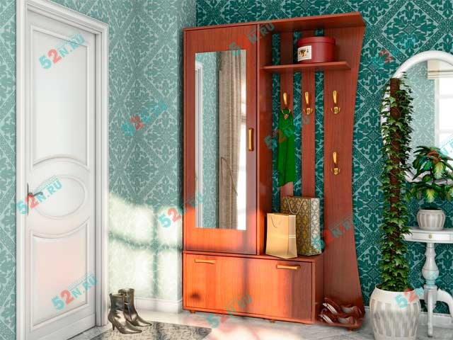 Отлично подойдет для небольшой комнаты. Большое зеркало — станет вашем помощником в выборе гардероба. Нижний ящик способен вместить большое количество обуви. В шкафчике за зеркалом три полки для хранения одежды и разных мелочей. Доступная цена!