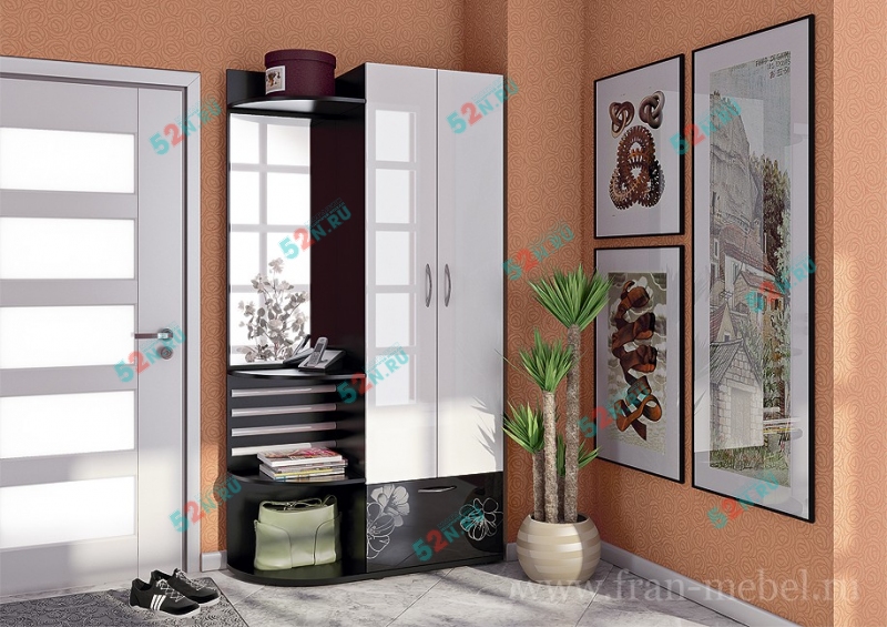 Данная прихожая является дополнением к гостиной с одноименным названием. Выполняется с глянцевыми фасадами белого и черного цвета, черный фасад декорируется рисунком «Ночная сакура». Обратите внимание на не большой размер, это даст возможности сэкономить пространства в небольшой квартире
