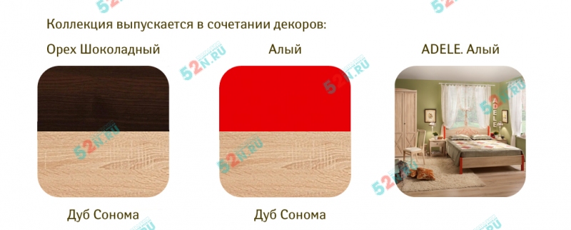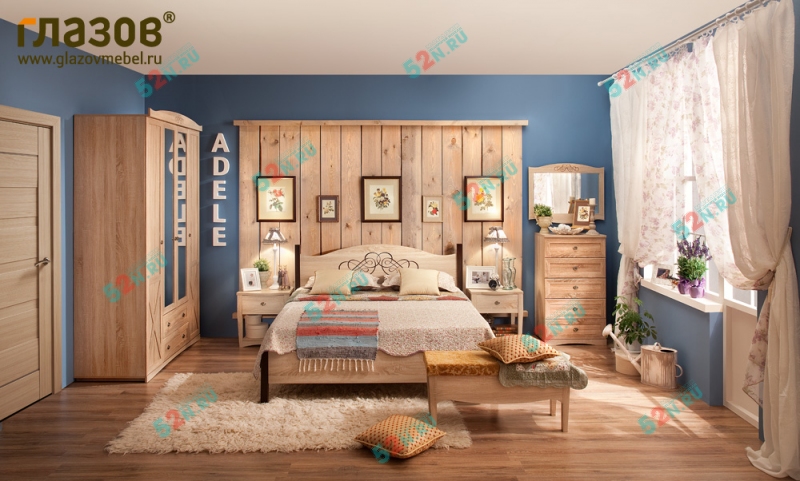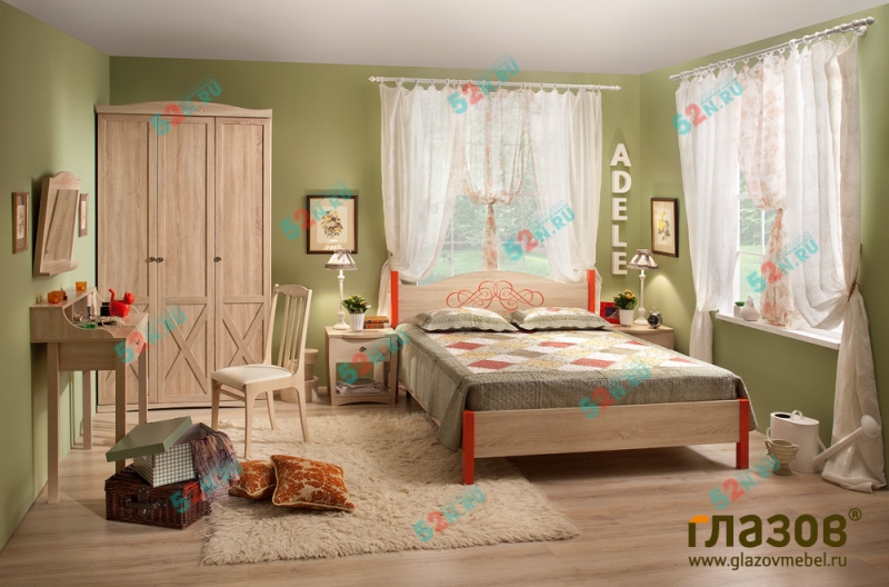 Коллекция для спальни ADELE в стиле прованс несет в себе особое очарование старины, ощущение гармонии и простоты, великолепие природы, полей душистой лаванды, необычайную легкость воздуха и игру солнечных бликов. Для коллекции подобран декор Дуб Сонома с текстурой натуральной древесины, с мягким и теплым оттенком, поэтому и зимой, и летом в такой светлой спальне будет уютно. В коллекции ADELE 5 вариантов ширины спального места кроватей: 1800 мм, 1600 мм, 1400 мм, 1200 мм и 900 мм. Стационарное основание с гибкими ламелями Вы можете подобрать на свой вкус, заказав его с металлической или деревянной конструкцией. Основания вынесены отдельной позицией и не привязаны ни к одной из коллекций мебели. Максимальная равномерная распределенная нагрузка на Основания для кроватей. Яркую индивидуальность кровати ADELE придают толстые кроватные опоры (50 мм) и изящный вензельный рисунок на изголовье в тон кроватным опорам, выполненный УФ-печатью. Вместительные шкафы позволят разместить в спальне весь Ваш гардероб. ADELE 9 Шкаф для одежды и белья выигрышно смотрится с 51 Карнизом, который придает шкафу изюминку и подчеркивает выбранный стиль Прованс, но и без него, с декоративной раскладкой на дверцах, выглядит тоже прекрасно. Двери шкафа с зеркалами в обрамлении профиля МДФ преобразят любой интерьер и станут настоящим украшением Вашей спальни. Зеркала визуально расширяют пространство, которого действительно не хватает во многих типовых квартирах. Ортопедическое основание в стоимость кровати не входит. Помимо кровати шириной 1600, имеются кровати шириной 900, 1200, 1400, 1800. Ортопедическое основание так же не входит в стоимость кроватей. За более подробной информацией обращайтесь к специалистам.