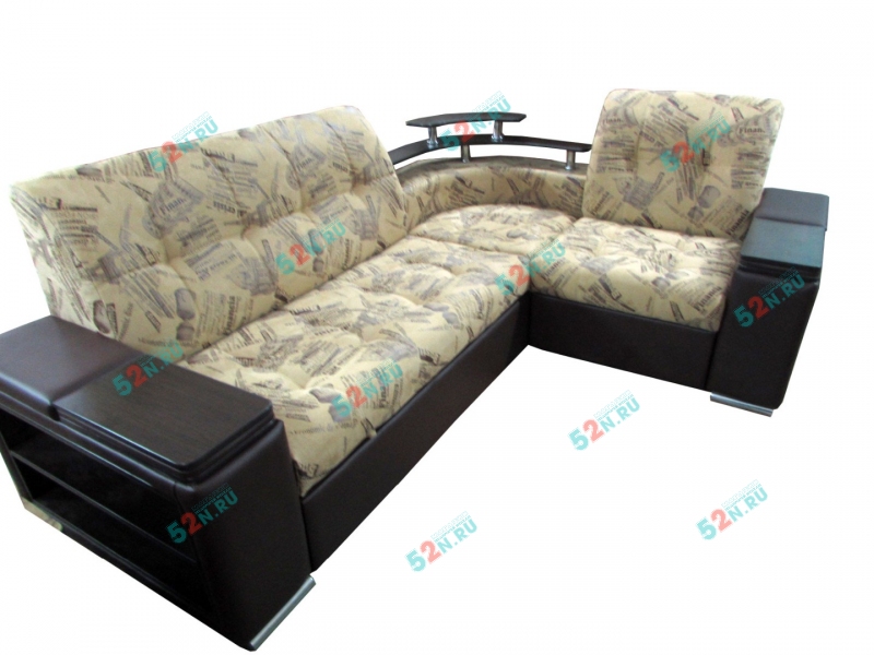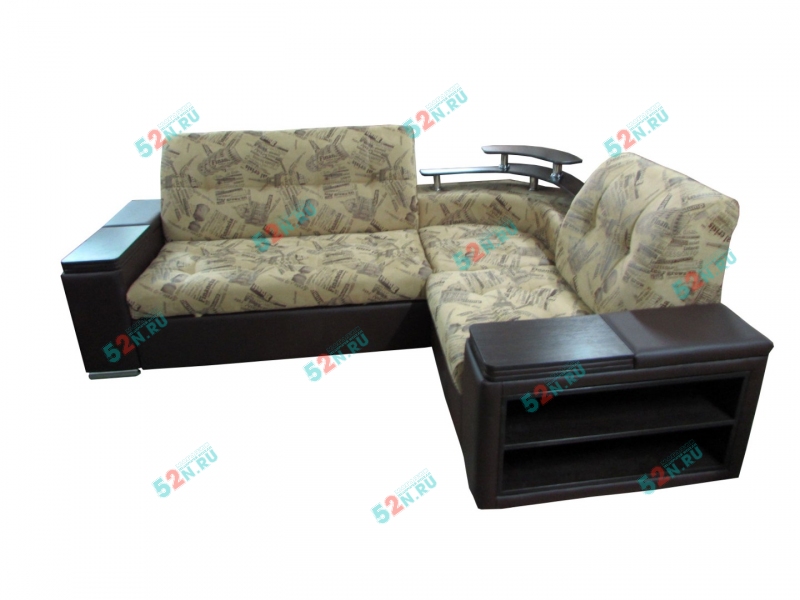 4. Мы предлагаем удачный по дизайну угловой диван «Токио». Он очень интересен своими широкими подлокотниками, ширина которых 20 см. Сверху они декорированы оригинальными вставками под дерево, в подлокотниках встроены удобные полки. Диван может комплектоваться подлокотниками, внутри которых устроены огромные ниши для различных предметов. В угловом секторе сиденье «перевертыш», с одной стороны сектора - столик из декоративного материала имитирующее натуральное дерево ЛДСП, с противоположное стороны - мягкое сиденье. Так же в угловом секторе предусмотрен оригинальный Бар из декоративного материала ЛДСП. Диван может комплектоваться двумя видами баров, большим и малым (зависит от комплектации)