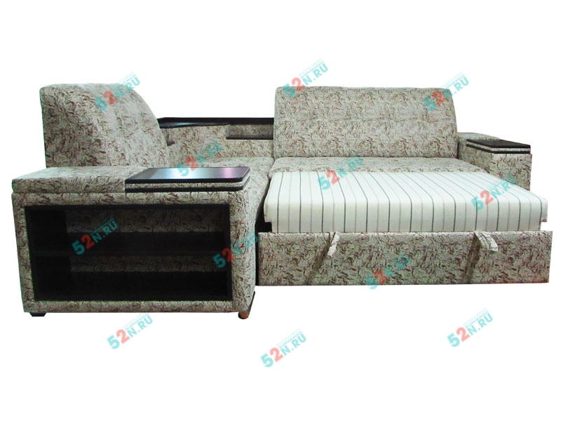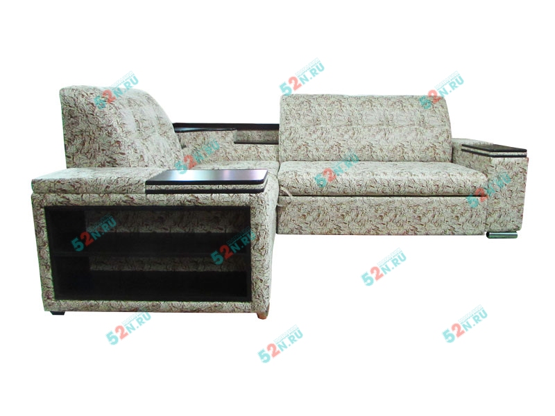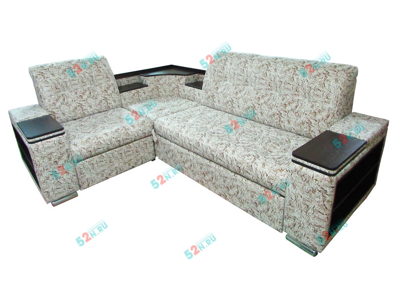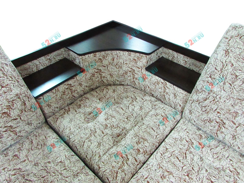 4. Мы предлагаем удачный по дизайну угловой диван «Токио». Он очень интересен своими широкими подлокотниками, ширина которых 20 см. Сверху они декорированы оригинальными вставками под дерево, в подлокотниках встроены удобные полки. Диван может комплектоваться подлокотниками, внутри которых устроены огромные ниши для различных предметов. В угловом секторе сиденье «перевертыш», с одной стороны сектора - столик из декоративного материала имитирующее натуральное дерево ЛДСП, с противоположное стороны - мягкое сиденье. Так же в угловом секторе предусмотрен оригинальный Бар из декоративного материала ЛДСП. Диван может комплектоваться двумя видами баров, большим и малым (зависит от комплектации)